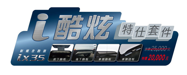 現在,在流體雕塑的新潮外觀之下,Hyundai推出了讓消費者多一份選擇的內外裝配備,讓強調「外貌協會」的人有更酷炫的視覺張力。讓喜歡「獨自欣賞」的人有自我空間的享樂機制。推出了「i酷炫」及「i享樂」的專用選配。Hyundai ix35的i酷炫特仕車(尊貴型),特價82.9萬元,增加的專屬配件有:前後下飾板、側踏板、車門下飾板及霧燈飾框。i享樂特仕車(尊貴型),特價84.9萬元,增加的專屬配備有:DVD、數位電視、GPS、藍芽以及倒車顯影。不只如此,交車還贈送專用行李箱隔板(價值8,000元),再送萬元配件。