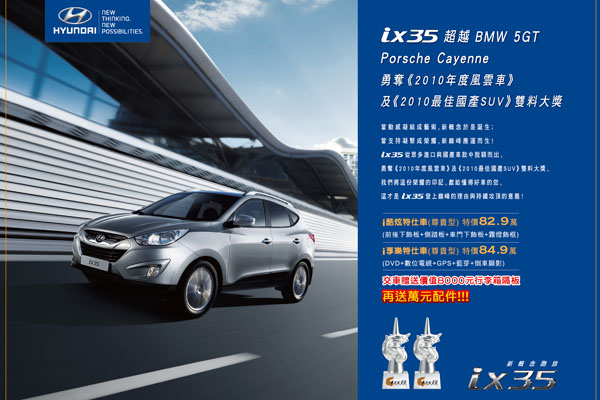 在2010年11月份勇奪車訊風雲獎中「2010年最佳國產SUV」及唯一的「2010年度風雲車」雙料大獎的Hyundai ix35,在車市極不穩定的狀況下,平均每月還有800多台並逐月增加的現象,足以表示ix35雙料冠軍的實力不容小覷。
