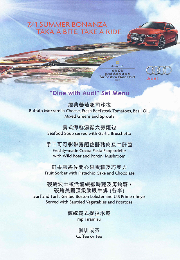 Audi品牌所蘊藏的科技、奢華氣息,一向為大眾所熟知,在2014年夏日,台灣奧迪汽車與香格里拉台北遠東國際大飯店合作,於其中的馬可波羅餐廳量身設計「夏艷Audi」專屬套餐,由馬可波羅餐廳的主廚以Audi品牌的精神設計菜色,讓民眾也能透過味蕾感受Audi的品牌精髓。