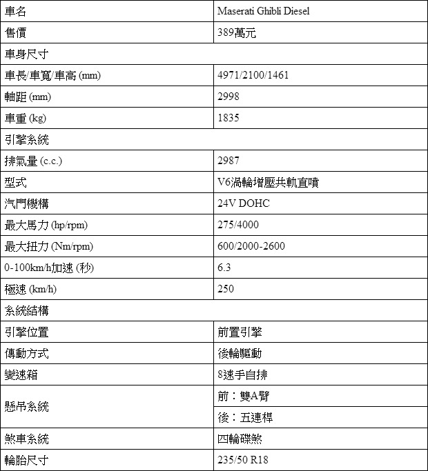 在Ghibli Diesel加入以後,Ghibli車系在臺灣以Ghibli Diesel、Ghibli、Ghibli Premium與Ghibli S Q4等四款產品構築了Ghibli車系的產品編成,分別開出389萬、412萬、458萬與512萬元的建議售價,擔任Maserati家族入門車系的角色。要價389萬元的Ghibli Diesel入臺,更再度拉近Maserati與一般大眾之間的距離。