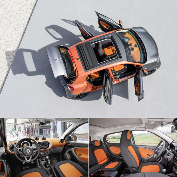 全新forfour在後門的開啟角度逼近90度垂直,這樣的設計更易於乘客進出,而forfour車型更全數標配前乘客座椅背傾倒功能,讓車室空間擁有更大的運用彈性。全新fortwo在車尾有著260公升的置物容積,forfour則僅有185公升的容積,然而在後排座椅打平後,forfour則可擁有730公升的車尾廂置物空間。