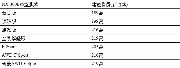 NX 300h自即日起在全台Lexus展示據點正式展售,而全車系的車型規劃與建議售價如下: