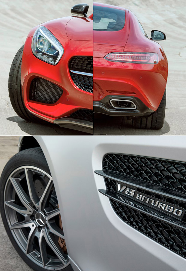 在其流線的外觀造型中,碩大的車頭水箱罩與兩側氣壩、車側的導流柵與車尾傾斜的斜背設計,可說是Mercedes-AMG GT外觀的主要辨識重點,而在此強烈的視覺衝擊底下,則是使用了鋁合金車體結構,搭配上鋁合金雙A臂、V8引擎與七速雙離合器變速系統後,將車身重量控制在1540kg程度。