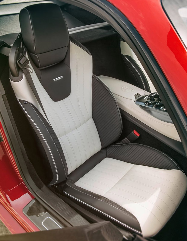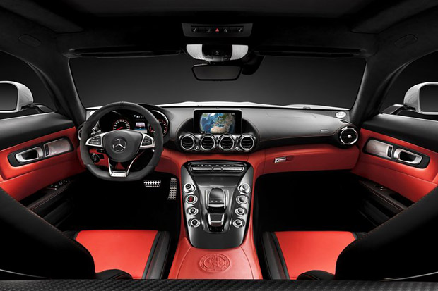 座艙內設計不僅可充分感受到Mercedes-Benz近年來營造的豪華科技氛圍,也可感受到Mercedes-AMG GT對於未來駕馭環境的視野與意念,大量的導入航空飛行器的設計元素,但中央7吋大面積的獨立螢幕、四只如聚光燈般的空調出風口等,仍與家族風格產生極大連結。中控台中央的簡化按鍵與整合觸控手寫板的COMAND控制介面為視覺重點,也藉此安排與引擎蓋下的V型引擎相呼應。因此控制介面的整合,與碳纖維、玻璃纖維與頂級皮革的大量運用,讓Mercedes-AMG GT將科技、熱血與豪華融為一體。