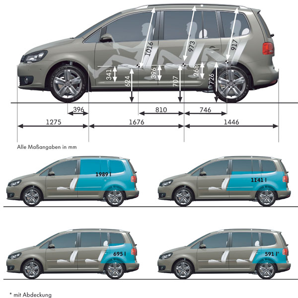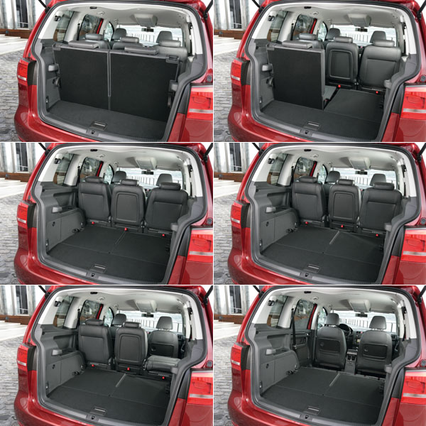 Touran第二排三張座椅皆可獨立滑移、折疊與拆卸,亦可依需求成為四人、五人、六人、七人座等不同配置,再加上自695公升至1989公升(後座椅背覆倒)的彈性行李廂置物空間。