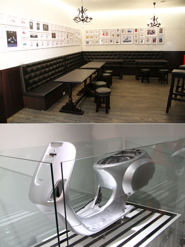 Vespa旗艦店除了包含各款機車展示外,另特別規劃了一個別具氛圍的會員休憩區,是依照60年代 Vespa的英國車迷所引領的 MODS風來設計;而Vespa最特殊的鋼製車體,也於展示間擺放一實品呈現。