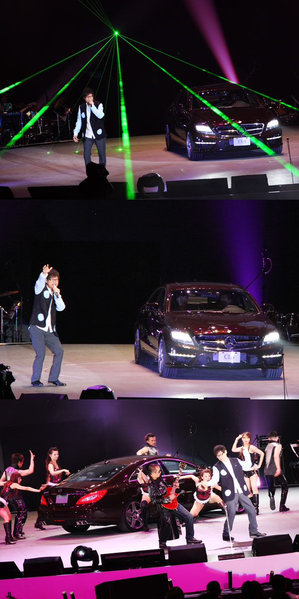 時尚動感的The New C-Class完美演出後,燈光變換,現場響起低沉狂暴的引擎怒吼,中央LED帷幕再度升起,經典四門轎跑The New CLS 63 AMG 霸氣現身,伴隨著“愛人同志”的搖滾前奏,音樂教父羅大佑帥氣步出The New CLS,重新詮釋“是否”、“戀曲1990”等名曲,最後以80年代風靡港台的“皇后大道東”收尾,完美演譯The New CLS經典尊榮、優雅獨特以及傳唱永恆的經典地位。