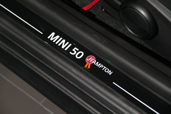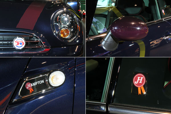 Mini Clubman Hampton車身外觀具有諸多特別設計的點綴,如後照鏡外蓋的Damson Red水波紋、位於B注的Hampton徽飾、車側方向燈飾板上的Hampton徽飾設計及水箱護罩上鑲嵌的50週年紀念LOGO。