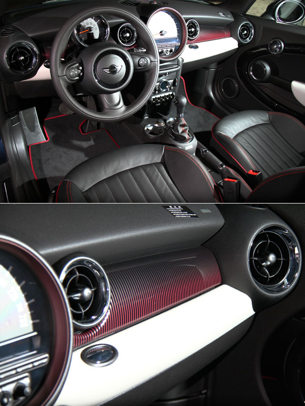 以全黑色調基底搭配以Damson Red滾邊並以精緻橘紅色縫線的真皮座椅展現非凡質感,配以皮椅邊緣的Hampton徽飾更加強調出Mini Clubman Hampton的與眾不同。