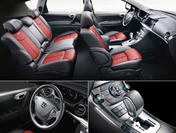 車室內部導入全新紅黑雙色內裝、紅色縫線高質感內門真皮把手、紅色縫線真皮包覆方向盤及Luxgen專屬電繡字樣等,讓車室空間內充滿強烈的跑格節奏,再加上航太智慧高反差儀錶板搭載類鈦金屬中控台飾板,營造出飛航式智慧駕駛座艙的未來感。