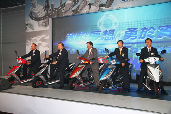 SYM全球經銷商大會中,三陽機車同步發表了三款內外銷重點機種,並於結束前由多位高層與車款合影。