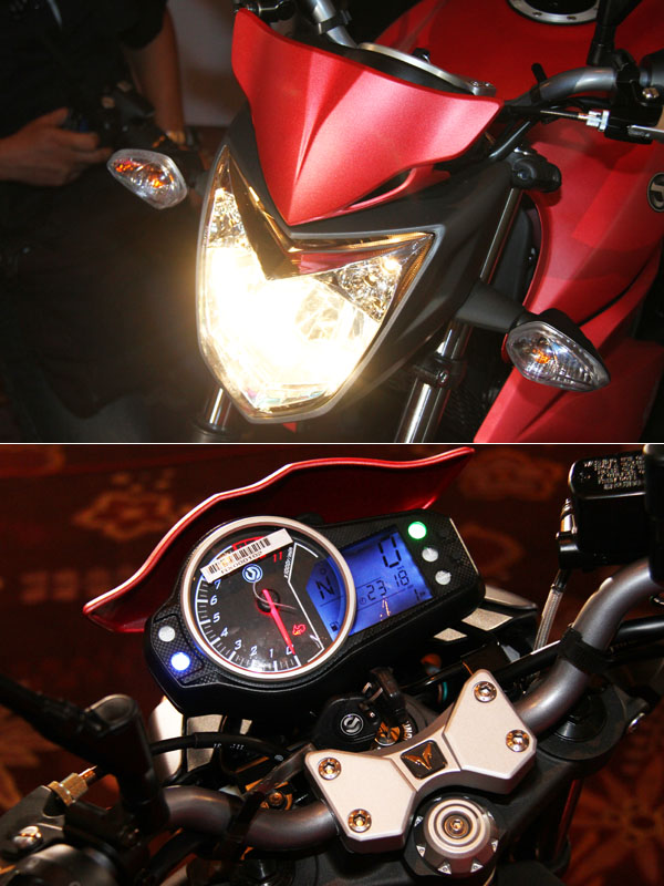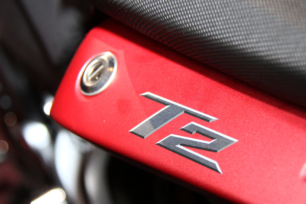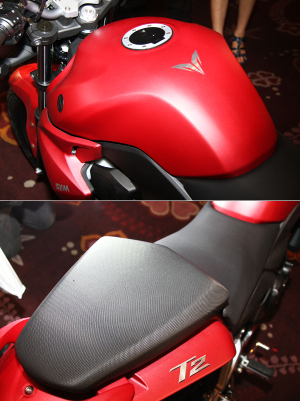 身為下半年重點機種的T2車型,定位為國產第一台4V水冷250c.c.街跑車,搭載全新4V結構汽油引擎,結合水冷系統,已循環冷卻原理降低溫度,搭配上反向平衡軸在高速駕馭時,有效抑制引擎震動;而在發表會現場也同時展出先前已於諸多兩輪論壇中曝光的兩量產車色,一為延續T1口碑而來的黃色,與首次推出的消光紅,另外還提供尚未曝光的消光黑與灰色,共計四款車色選擇。