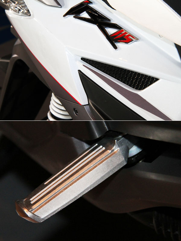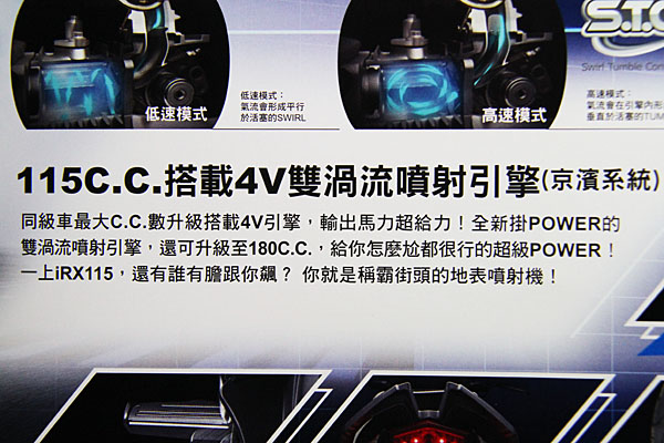 另一款則為本年度主力銷售車種、2011年全面升級的iRX115車型。iRX115全車造形導入飛行器概念,採飛梭導流設計,高速操駕時可有效降低風阻;酷炫配備LED飛行定位燈,提升辨識度與行車安全性。動力系統方面搭載S.T.C.S 4V雙渦流噴射引擎,不但為同級車款中引擎規格最大排氣量,並導入後雙避震等配備,建議售價則為新台幣68,000元。