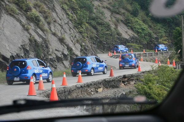 環島團隊此行最驚險的時刻發生在進入北橫後,途中在台7線70公里處道路正在施工,僅准單向通行,車輪外側30公分就是懸崖,令人膽顫心驚。所幸,當12輛W'car一一順利通關,靈巧小車的操控性與駕駛容易性不證自明。