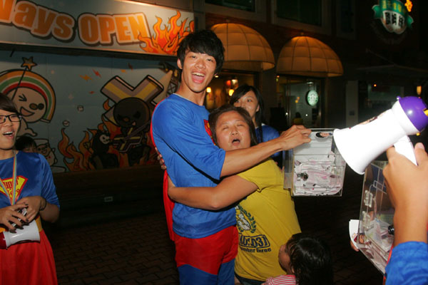 夜晚在墾丁大街「96五超人」再度穿上超人裝,向遊客們募集愛心發票,捐助弱勢團體,並給大家「愛的抱抱」。
