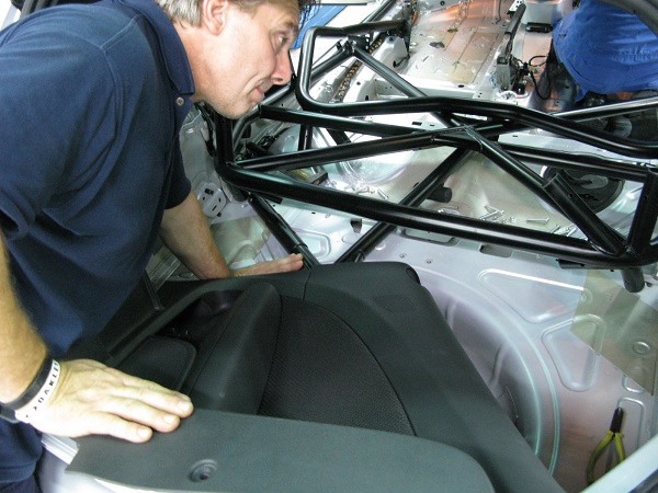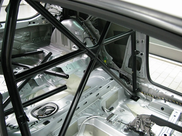 Tohmas將德國寄來的防滾籠先在空位上先組裝,然後清點料件,接著就開始組裝的工作,由於這組防滾籠在德國已經先行試裝過,而且合乎FIA規範,在台灣安裝僅需要注意底盤鑽孔的防銹處理,以及安裝的位置,有四個支點鎖到底盤上,另外後方兩個支點鎖到後方輪弧上,這樣都是要鑽洞然後以螺絲對鎖固定,每個鎖點都是三支螺絲鎖上,防滾籠的上方並不接觸車頂,也不在車頂固定,完全就是以底盤為基礎,鎖定後型成一個抗扭曲變形的保護區。