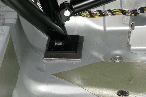 防滾籠在車內腳座部分還要加一個金屬墊片,實際鑽孔則是現場量測以後再實際鑽入三孔。