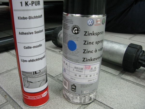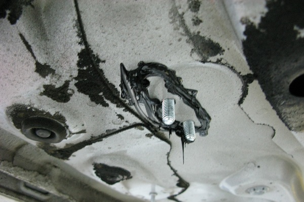 這是車底鑽孔後,放入兩個螺絲釘固定位置,再打膠來防鏽與黏住下固定墊片。