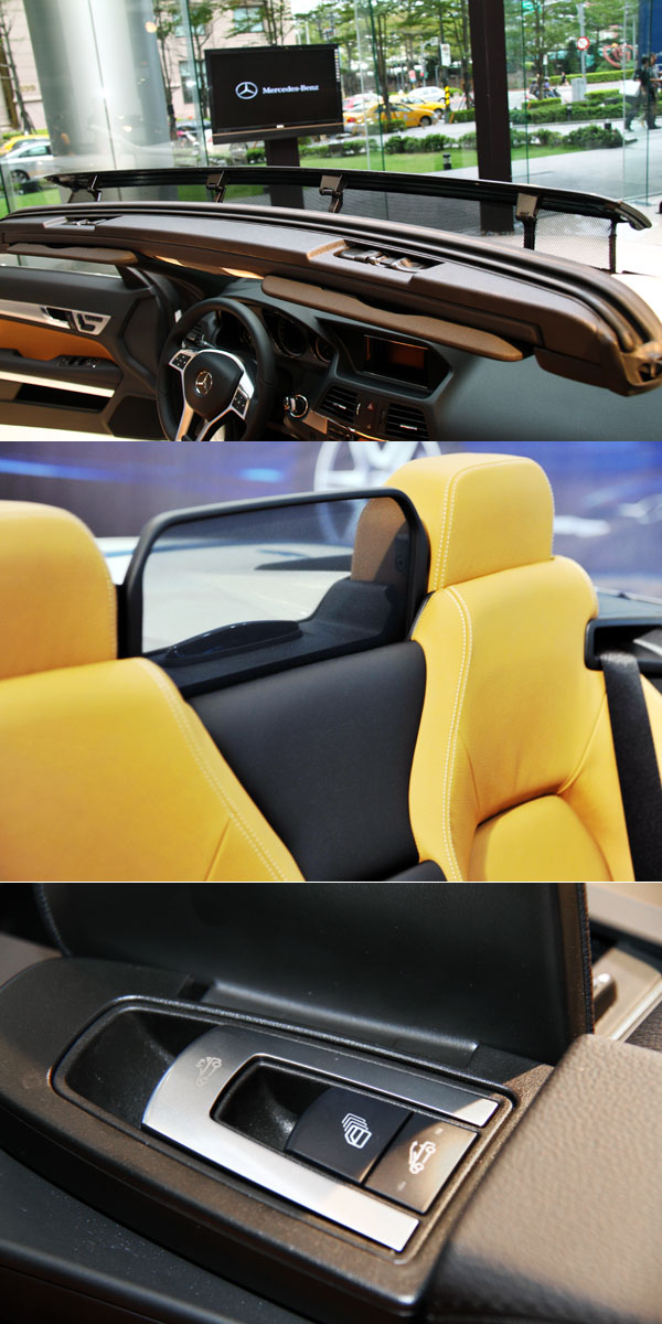 Mercedes-Benz為E-Class Cabriolet在充沛的動力基礎上,加載了兩項貼心的舒適科技,包括世界首度發表的AIRCAP®自動防風帽,時速達到160km/hr前,皆可使用壓下按鈕方式作動,利用前擋風玻璃外框緣延伸出的防風葉板(Wind deflector),提升6公分高度,抬高劃過前擋之風切氣流,搭配後座頭枕間的防風網(Draught-Stop),可保持車內四座乘客周圍的氣流穩定,降低風噪,提升車室安靜與舒適度,即使至車輛高速行駛時,乘客髮型也不會吹亂,優雅一如坐入房車之中;同時,若系統偵測到PRE-SAFE®作動,AIRCAP®防風葉板與防風網會自動收入擋風玻璃邊框內,保障乘客安全。