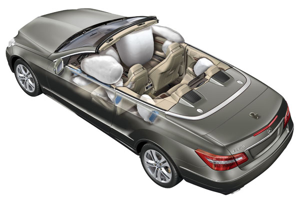 Mercedes-Benz特別強化了E-Class Cabriolet之A柱結構,提供駕駛人開篷中的行車安全,A柱內部加入管狀強化鋼樑,而後排座椅頭枕後方、設置有直徑達35mm之防滾架,當感知器偵感測到車輛有翻覆危險時,會在0.3秒內自動伸起,提供強力支撐,預留充足空間以保護乘員的頭部安全。同時,E-Class Cabriolet更首度搭載了敞篷車專屬的兩具前座頭部氣囊,置於車側門板安全帶伸出處前方,遇到危險情況作動後,可延伸展開0.7m x 0.5m保護面積 (17公升),搭配另外7具安全氣囊,完整守護駕駛與乘客之安全。