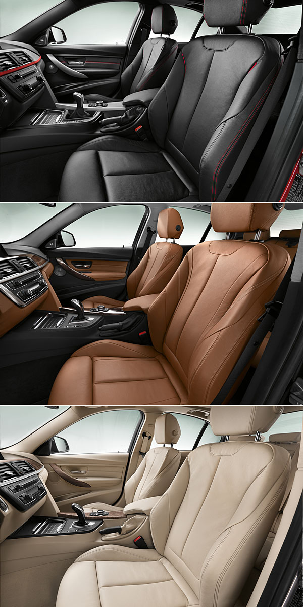 為了提供消費者媲美客製化的購車選擇,新世代三系列在車型規劃時依照配備定位提供了Sport Line、Luxury Line與Modern Line三種等級,於外觀上與內裝中的設計有著些微差異。相同於外觀面的進化程度,新世代三系列的內裝設計依舊不脫近年來BMW的設計風格:稍微的駕駛取向、懸浮式的控台設計、簡化的儀表介面、不對襯的排檔座與周邊總成等,不過利用了不同材質的鋪陳,讓座艙內的層次更為分明,此般設計也成為不同車型等極發揮創意與差異的題材,如Sport Line的金屬飾板運用與Luxury Line及Modern Line車型的木紋飾板設計等,便有了清楚的氛圍劃分。