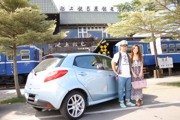 台東池上飯包創始店以復古的建築搭配老火車,充滿懷舊氣息,與時尚有型的New Mazda2形成對比美感。