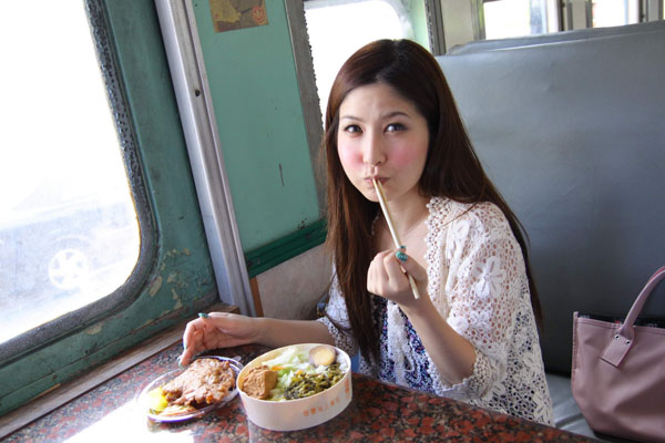 在老火車車廂中享用台東池上米製作的火車便當,別有一番風味。