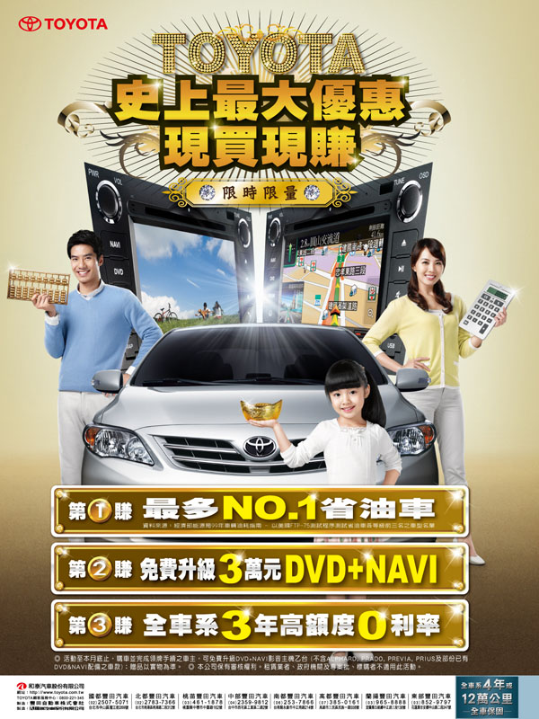 本次史上最大的優惠活動將自即日起展開至11月30日止,有購車需求的消費者,請儘快把握此一良機,逕洽Toyota全國經銷據點或至Toyota網站(www.toyota.com.tw)查詢相關優惠資訊。