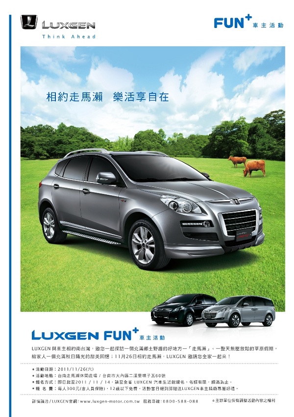 而為提供車主朋友們最高規格的活動品質,「LUXGEN FUN+ 相約走馬瀨」車主活動的名額有限,敬請車主儘速至全台LUXGEN汽車生活館報名,欲知活動詳情請洽LUXGEN活動官網http://www.luxgen-motor.com.tw/event/2011funplus/查詢。