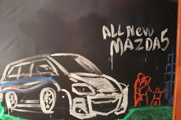 日前范學文老師受邀參與Mazda舉辦的All New Mazda5發表活動,在發表會上以光影畫獨特的螢光材質和光影手法,展現一家人和樂融融駕著All New Mazda5出遊賞景的幸福畫面。當老師完成整幅畫的構圖,一筆一筆帶出All New Mazda5車側醒目的流體線條時,絢麗的光影色彩與「Nagare」流體線條的搭配契合,瞬間讓現場爆出如雷的掌聲。
