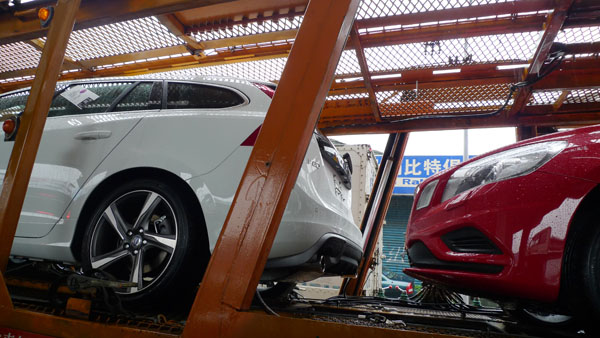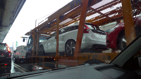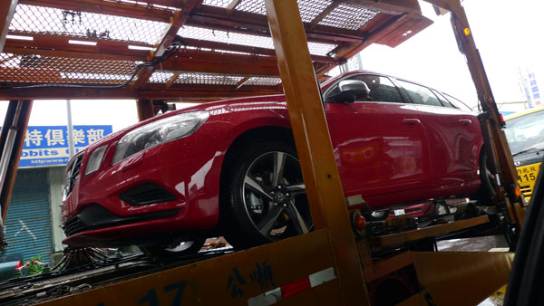 11日早上就在小編經過中山高圓山路段時,忽然發現前方約100公尺外,有輛拖板車載著兩輛Volvo新車,兩道直立弧形尾燈十分顯眼,原以為是輛XC60,但是再多看一眼後才驚覺不對,這兩輛看似休旅車的Volvo新車車高高似乎較低,而且紅色塗裝也與S60採用的相同,研判是全新V60,因此,立馬就在壅擠的車陣中努力趕上,最後終於在下交流道後跟上,二話不說就先拿出相機拍下這兩輛眾所期待的新世代旅行車。