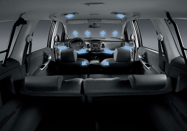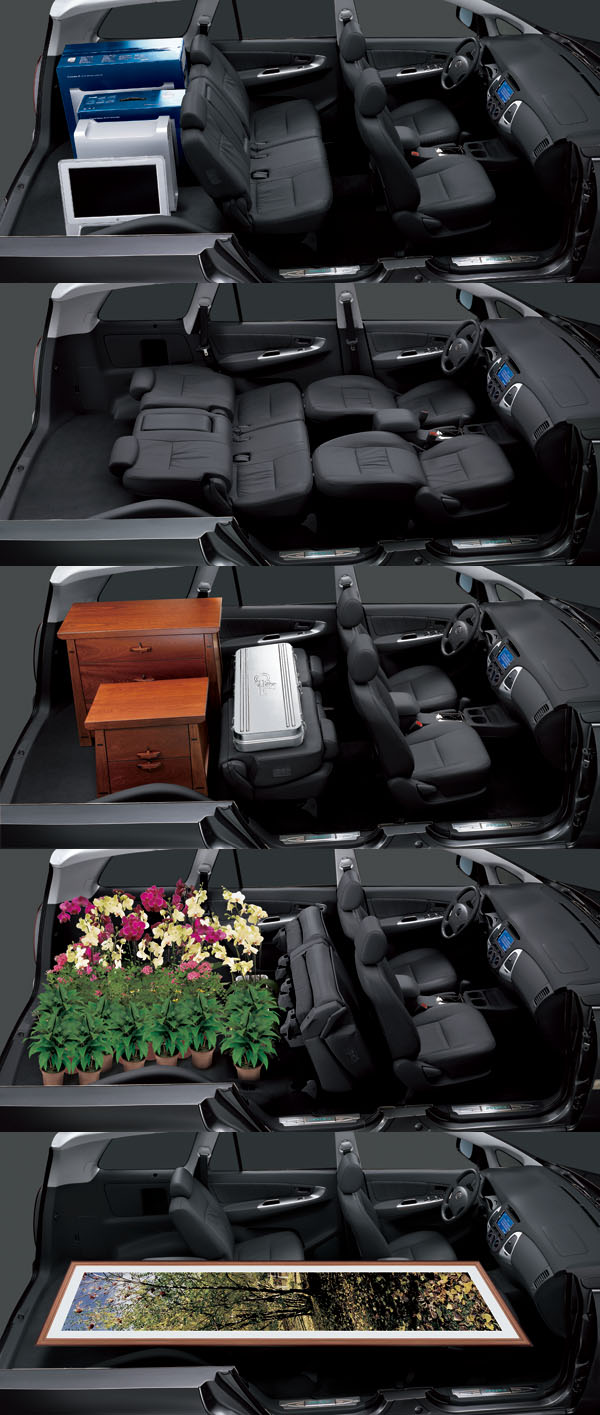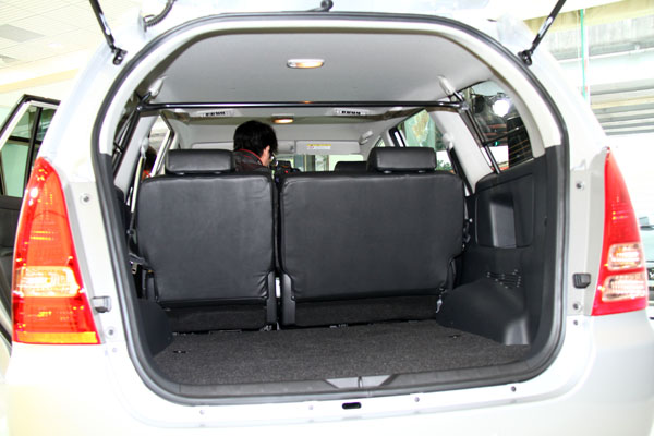 座艙中,Innova 2.0L融入「先進+舒適+機能」三種概念,改變傳統對商用車廉價、陽春的繼定印象。空間部分,彈性多變化座椅設計,讓客人不論在乘坐、休閒或工作上均可獲得最大滿足。Innova 5人座+1.7立方米的大後廂空間,可輕易滿足載客及一般裝載的多樣需求。透過第一排座椅的前移及一、二排打平,即可創造出平坦舒適的休息空間。透過第一排座椅前移及第二排6/4分離功能,可提供超長物品置放空間。而將第二排座椅往前摺疊及前翻,可提供更大置物空間。