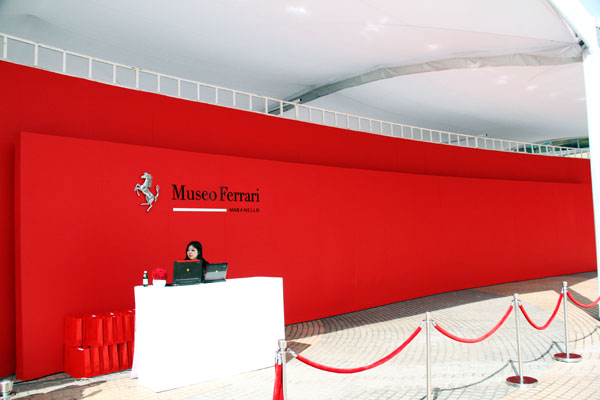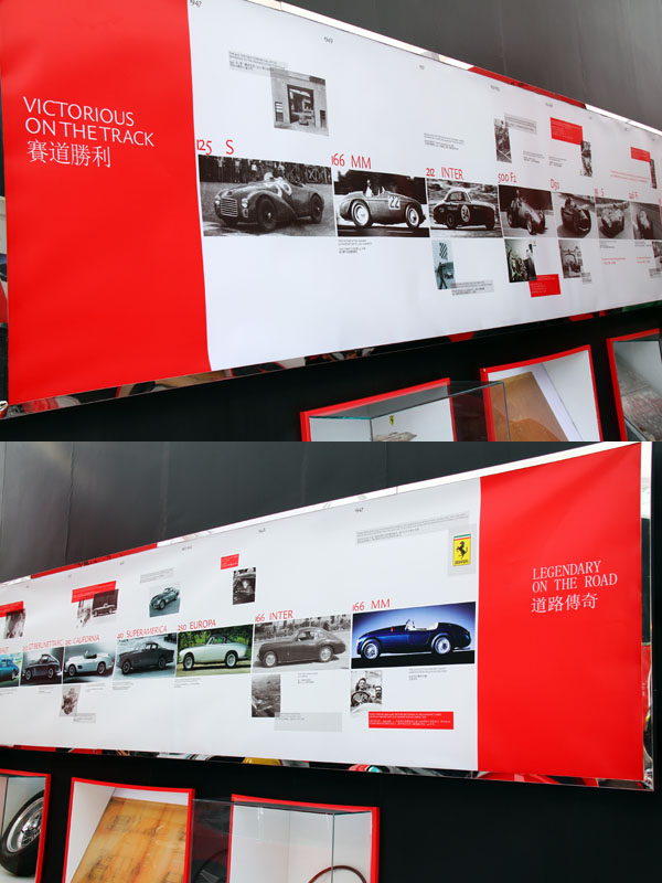 展區的總面積為120平方公尺,按直線主軸佈局,分列兩側的賽車展區和GT跑車展區,以時間順序劃分成三個部分。展區內陳列了眾多的珍貴實品、圖片和影像資料,分別講述Ferrari法拉利傳奇的誕生、科技的創新發展,及產品的獨特性和尊榮感。