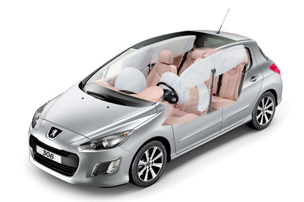 被動安全部份,308 2.0 HDi配備8具SRS輔助氣囊,308 SW 2.0 HDi及308 1.6 HDi車款為6具SRS輔助氣囊,危機狀況中以確保最完善的被動安全保護;針對車內幼童安全防護,308全車具備兩組三點式Isofix兒童安全座椅固定裝置,更配備電子式兒童安全門鎖及後電動窗兒童安全開關,將車內大小成員盡到最大防護之責。主動及被動安全完整結合,使308能夠通過EuroNCAP五顆星最高安全肯定,無論在成人防護、前方撞擊、側向撞擊、孩童防護、行人防護皆拿下同級車款中最高分,勝過多款歐系同級對手。