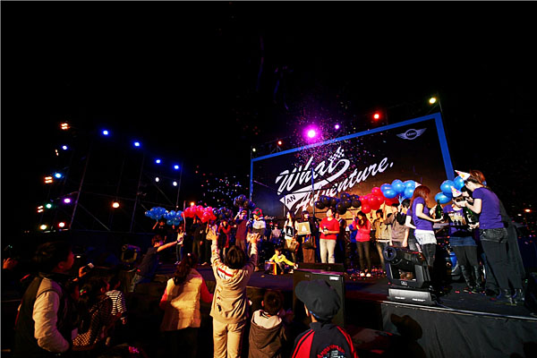 隨著天色漸暗,Mini粉絲的活力可沒有因為下午的滿檔行程而有半點減退,在Mini粉絲開此享用精緻露天晚宴的同時,Mini團隊率先祭上大驚喜,邀請三位當天生日的粉絲登上舞台,讓上千位粉絲一同慶生分享喜悅!緊接在生日驚喜後的是Mini精心企劃的英倫輕搖滾Live band演出與極限跑酷秀,不間斷的視覺與聽覺饗宴將Mini粉絲的熱情喝采推到最高峰!當Mini團隊宣布即將公佈Mini Day 2011 Super Star票選前三名得主時,舞台下方更響起一片歡呼,上千位Mini粉絲屏息以待獎落何處-來自高雄的車主,在原本就加裝JCW改裝品的紅色Mini Cooper S上貼滿賽車風格車貼,超級熱血的風格高票獲得全場青睞奪得第一寶座;亞軍是經典Mini Clubman車型,渾身經典復古元素,也引起粉絲一片好評;獲得季軍的則是來自台北的車主,綠色Mini Clubman以局部金黃色車貼綴飾,展現出獨特的個性品味。勇奪獎項的車主們雀躍抱回大獎,但最令現場粉絲感動的是,現場近400台特別打扮的Mini,每一台都代表著車主獨一無二的個人風格,驕傲地說出身為Mini世界一員的榮耀!Mini Day 2011再一次地成功齊聚上千位車迷,團結一致展現創意十足的Mini精神!