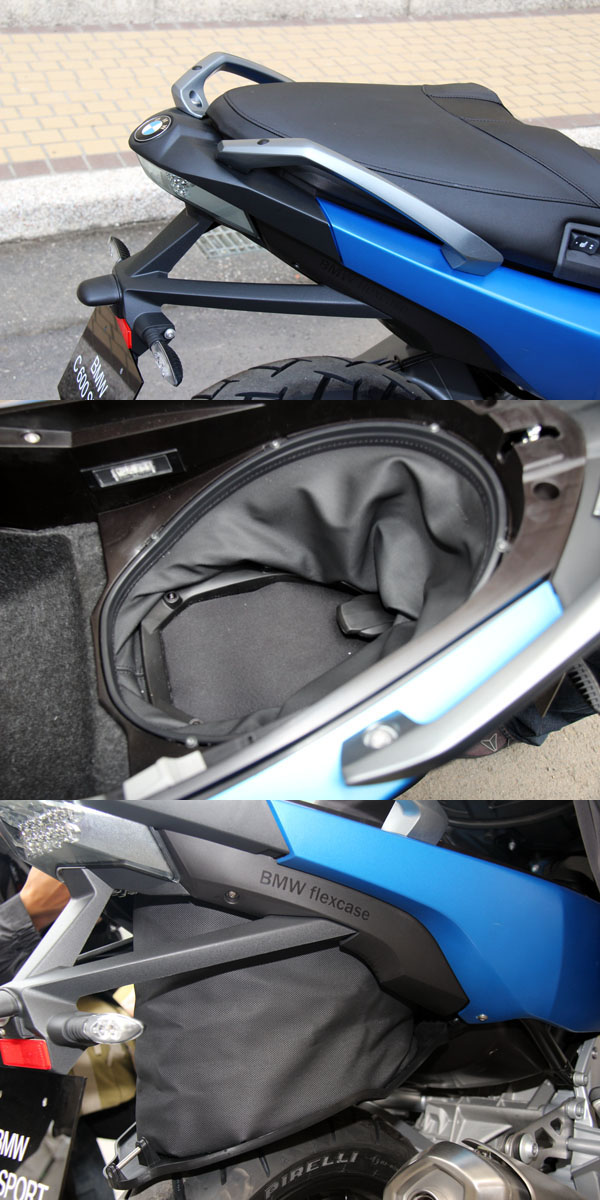 BMW獨創的Flexcase置物車廂彈性延展設計,讓置物車廂空間可獲得充分延伸,但是當Flexcase氣統開啟後,車輛即無法啟動,主要提供車主停車後放至另一頂安全帽或隨身行李使用。