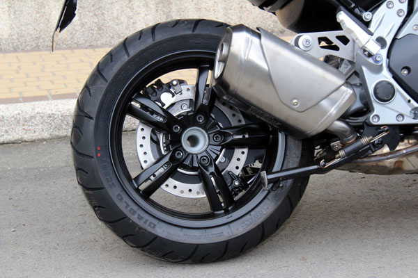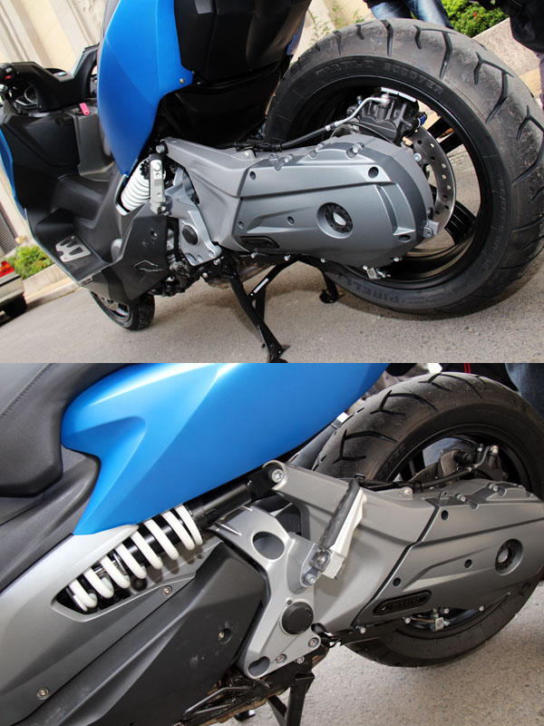 C 600 SPORT後軸採用了單搖臂設計,並且使用鏈條驅動,以增加耐用度,獨特的平置式避震系統也是大型速克達僅見的設計。