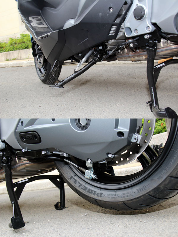 有別於同級對手另於騎士前方空間設計駐車煞車拉桿,C 600 SPORT另一項獨創的設計,為側向支撐桿同時也兼具了駐車煞車功能,當車輛暫停,騎士踢下側邊支撐桿後,連動結構就會鎖定後輪煞車碟盤,避免車輛因滑動而倒車。