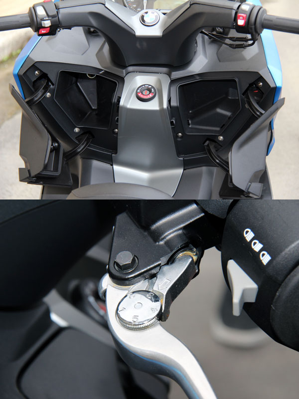 C 600 SPORT於前方設有兩個貼心的置物空間,容積為大型速克達少見,並且還具備五段可調煞車握桿調整功能,以應付不同身材騎士需求。