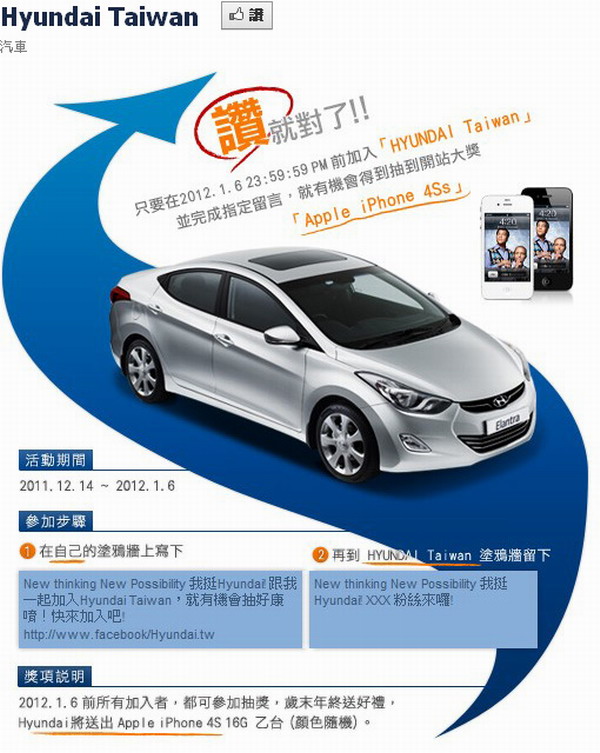 只要在2012年1月6日的23:59:59前,在自己的FB粉絲頁面寫下:New Thinking New Possibility,我挺Hyundai跟我一起加入Hyundai Taiwan,就有機會抽好康哦!快點加入吧!http://www.facebook/Hyundai.tw