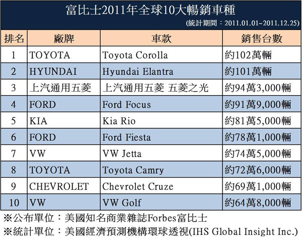 Hyundai再傳捷報,Hyundai All New Elantra,在美國知名商業雜誌《Forbes富比士》,日前所公布的2011年度世界10大最暢銷車種,Hyundai All New Elantra以銷售台數約101萬輛的成績,直逼Toyota Corolla約102萬輛的銷售,排名2011年度世界10大最暢銷車種第二名。Hyundai憑藉著德國設計中心的流體雕塑車體暢行世界,讓全球的消費者青睞不已,因此在美國經濟預測機構環球透視(IHS Global Insight Inc.)統計中,列入了世界第二名之位,這對Hyundai來說亦是世界肯定的一項殊榮。