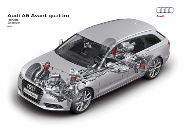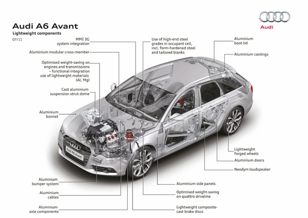 全新A6 Avant在車身主體結構的每一個關鍵部位,均運用Audi Ultra輕量化科技這項獨步車壇的專精技術,採用先進的複合式材料完美融合傳統鋼材與20%鋁合金精心打造,讓車重足足比傳統鋼材車體結構減輕15%,進一步提升車體剛性、抗扭曲性與撞擊時的承受強度,而全新A6的車架總重也僅有332kg!至於車體的其他部份如車身A/B柱、座艙樑柱、車頂結構以及車身側樑等結構部件,則以具備極佳的延展性的高強度熱塑形鋼材打造,加上鋁合金材質的引擎蓋、行李箱蓋、車門鈑件、前葉子板、中控台橫樑、前/後懸吊支柱固定座等重要組件,完美實現極致輕量化的目標,其中A6 3.0 TDI quattro的車重更大幅減輕80kg,拜先進的輕量鋁合金複合車體技術(Aluminum hybrid body)所賜,全新A6將 Audi Ultra這項先進技術的強大優勢徹底展現!