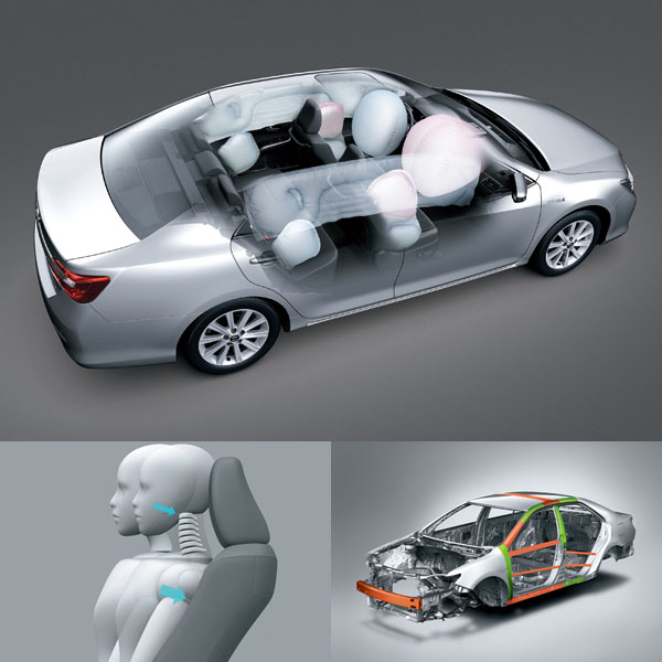 在被動安全方面Camry Hybrid是國產車唯一搭載8 顆SRS氣囊之車型(Hybrid-Q),縝密防護車內的每個乘員,加上採用980 Mpa 軍事級高張力鋼材打造的GOA車體,可吸收並分散衝擊力道,減少車室形變增進乘客安全。雙前座束力限制預縮式安全帶,加上WIL頸椎傷害緩和前座椅及HIP頭部衝擊緩和結構,面對突發狀況皆能將傷害減到最低。
