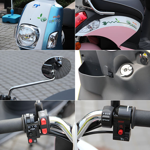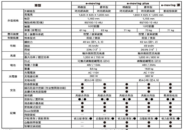 外觀上,針對不同的客群展現不同設計風格,「e-moving plus」造型線條優雅時尚,「e-moving漾」則展現酷炫動感的個性風格,並賦予「金橙武」及「龍澤秀銀」專屬車色。承襲原「e-moving電気二輪車」血統,「e-moving plus」、「e-moving漾 」在動力性能上再升級,搭載了1,600W「高效率輪邊馬達」,並採用20Ah高容量磷酸鋰鐵電池,在定速30km/h狀態下,大幅提升續航力至62公里,不論是上下班通勤、公務使用、代步採買、及親友接送等皆好用,是台多功用途的代步交通工具。在工業局TES輕型車變速測試條件下,載重75kg續航力有52.4km優異表現,相當於平整道路正常行駛條件下的實測水準;當載重小於55kg時,續航更可提升至55~60km,在75kg單人乘載下,爬坡最高可達15度水準。