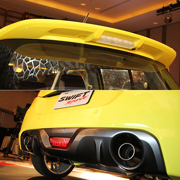 全新Swift Sport外觀上建立於一般全新Swift車型基礎上,但重新塑造鋼砲的性能風貌。導入燻黑鷹眼HID頭燈,搭配空氣力學套件,包含前擾流下護板,及鷹翼前霧燈;車側側裙搭配17吋鋁合金輪圈,簡潔俐落;車尾搭配流線型後擾流尾翼與左右雙出尾管,展現Swift Sport運動十足的風格。
