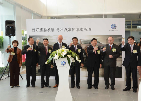 歡慶福斯商旅新莊億利旗鑑展間開幕慶祝貴賓,(由左到右)新北市議員黃貴蘭、新北市新莊區區長許炳崑、太古標鎰汽車總經理高振榮、福斯商旅亞洲區銷售經理Mr. Dietmer Pohl、億利汽車董事長張德勝、新北市議會議長陳幸進、福斯商旅亞洲區售後服務經理 Mr. Hubert Korzuscheck、福斯商旅經銷商聯誼會會長楊文通。