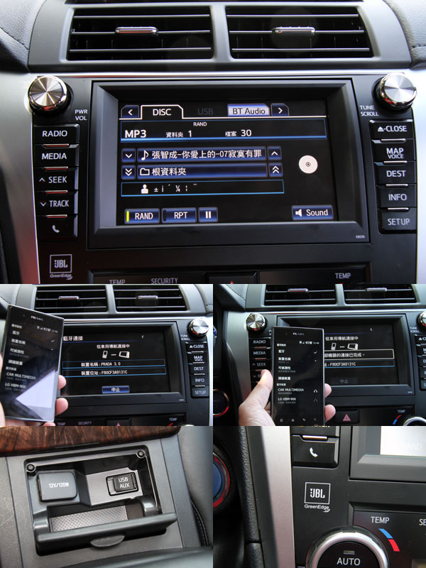 Camry Hybrid搭載了功能強大的多功能資訊整合系統,並且採用了JBL音響,除基本的廣播、CD播放功能外,亦具有藍牙連接與USB、Aux-in等外接介面,擴充機能齊全。