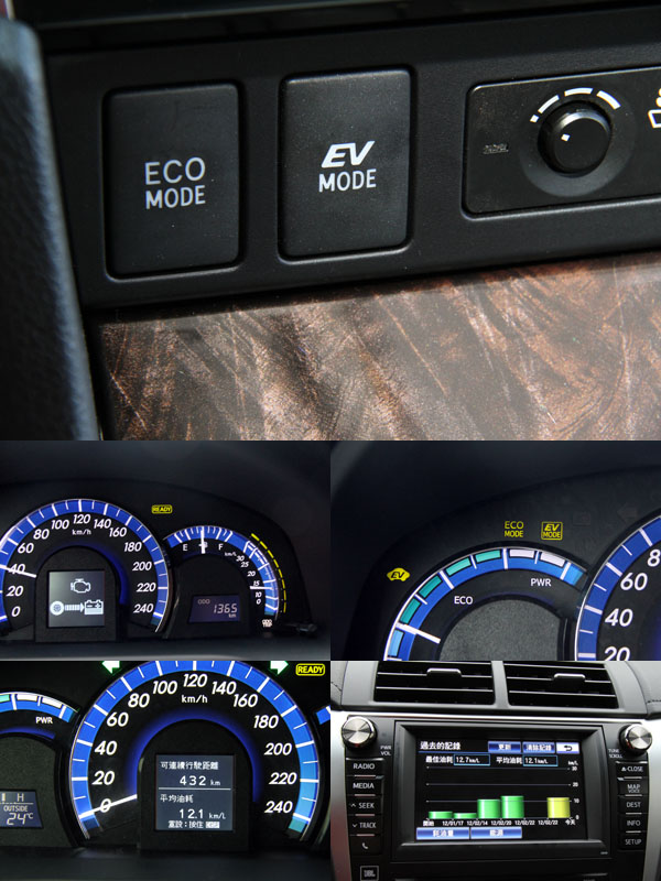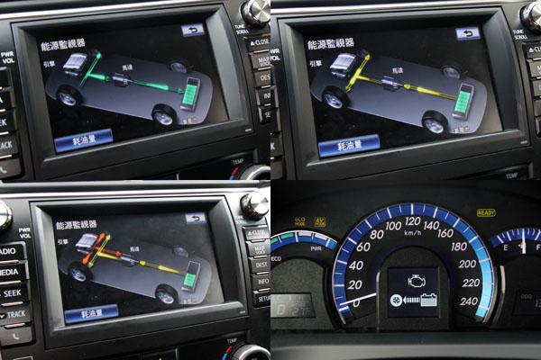 在Camry Hybrid上儀錶板資訊幾乎都是依據節能訴求建構,除了中央的時速錶以及基本的油量錶,轉速錶已由動力輸出錶取代,右側還有瞬間油耗錶,時時刻刻提醒駕駛節能,另外還有eco與電動模式,增加節能效應,但電動模式必須在電池蓄電量充足與時速40km/h以內才能使用。