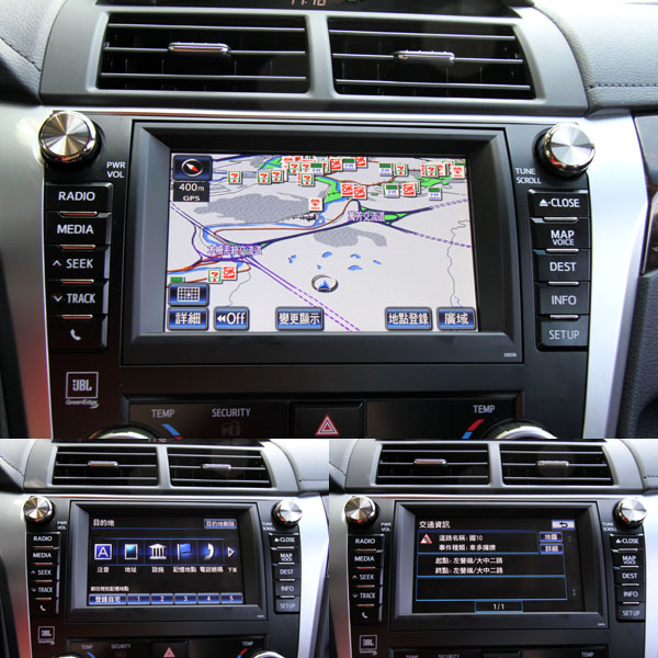 Camry Hybrid Q所搭載之多功能資訊整合系統中亦配有功能完整地衛星導航系統,同時還具備即時路況功能,讓駕駛可以時時掌握路況。