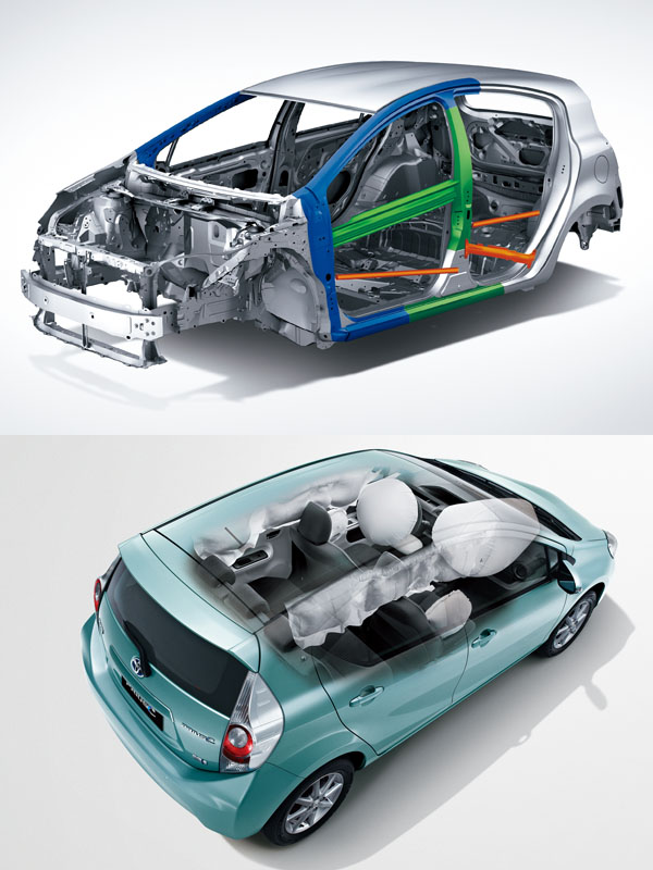 小車卻擁有媲美高級房車的安全配備。Prius c以完善的主動安全預先提供各項行車輔助與防護:VSC車身穩定控制系統、TRC循跡防滑控制系統、EBD電子煞車力道分配系統、HAC斜坡輔助系統等,協助駕駛者安全且安心地控制車輛。被動安全方面,則以7具SRS氣囊提供最完善的安全保護,同時輔以車體結構大幅提升的GOA車體及WIL主動式頭枕,提供撞擊時最佳防護(高鋼性鋼材使用達12%)。